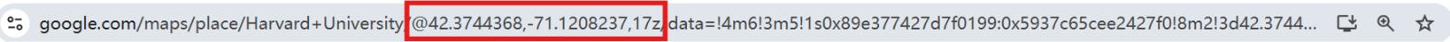 如图,搜索并选择Harvard University后,地址栏有纬度,经度,缩放级别,对应填写即可。
