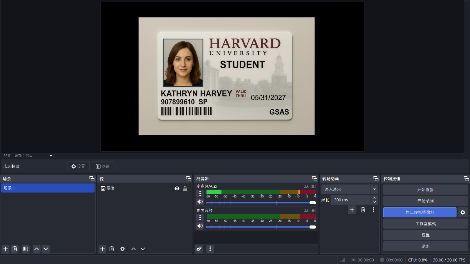 https://obsproject.com ,安装并打开。准备好学生证,调整好角度,启动虚拟摄像机